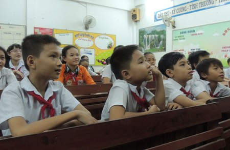 Trường Phổ cập giáo dục tiểu học phường 12 hoạt động “ké” trụ sở Trường tiểu học Bình Hòa (quận Bình Thạnh) vào ban đêm nên lễ khai giảng của thầy trò cũng diễn ra theo lịch học quen thuộc đó.