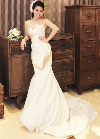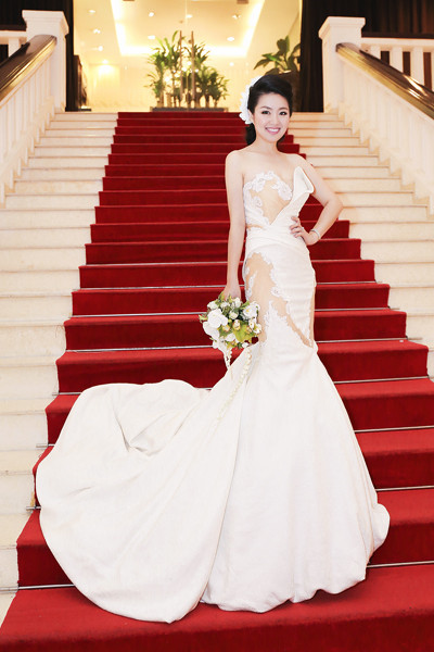 Ngoài ra, chiếc áo dài của nhà thiết kế Thuận Việt lúc đón khách khiến cô trông dịu dàng đằm thắm hơn.