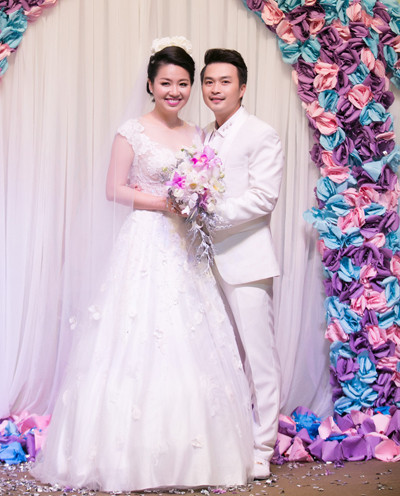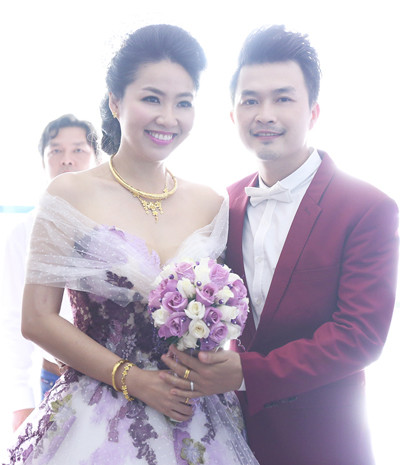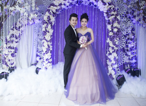 Trước đó, ở tiệc nhà trai 27/12, Lê Khánh diện hai trang phục có tông màu tím "ton sur ton" với không gian cưới.
