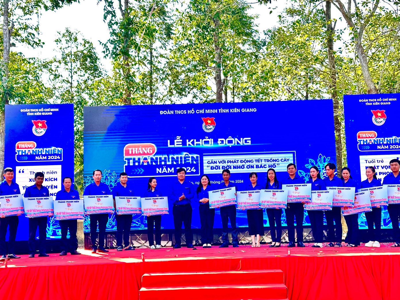 Tại lễ khởi động, Tỉnh đoàn đã vận động các nguồn lực và tổ chức trao bảng tượng trưng các công trình, phần việc sẽ triển khai thực hiện trong Tháng Thanh niên cho các đơn vị với tổng trị giá trên 2 tỷ đồng gồm: Trao tặng 2 căn Nhà Nhân ái trị giá 100 triệu đồng, 50 bộ năng lượng Mặt Trời xây dựng Công trình Thắp sáng đường biên trị giá 100 triệu đồng cho Huyện đoàn Giang Thành; Tặng cho Huyện đoàn Tân Hiệp 110 suất quà trị giá 55 triệu đồng, 01 Công trình Thể dục ngoài trời trị giá 30 triệu đồng, 1 căn Nhà Nhân ái trị giá 50 triệu đồng; Tặng 30 bộ năng lượng mặt trời xây dựng Công trình Thắp sáng đường quê cho Huyện đoàn Gò Quao trị giá 80 triệu đồng; Tặng Huyện đoàn Vĩnh Thuận và Châu Thành mỗi đơn vị 1.000 cây xanh; Tặng Huyện đoàn An Biên và U Minh Thượng mỗi đơn vị 500 cây xanh; Tặng Huyện đoàn Giồng Riềng 500 cây bông trang; Tặng Thành đoàn Phú Quốc 10 xe đẹp trị giá 10 triệu đồng và tặng Huyện đoàn Vĩnh Thuận 100 bao xi măng trị giá 10 triệu đồng.