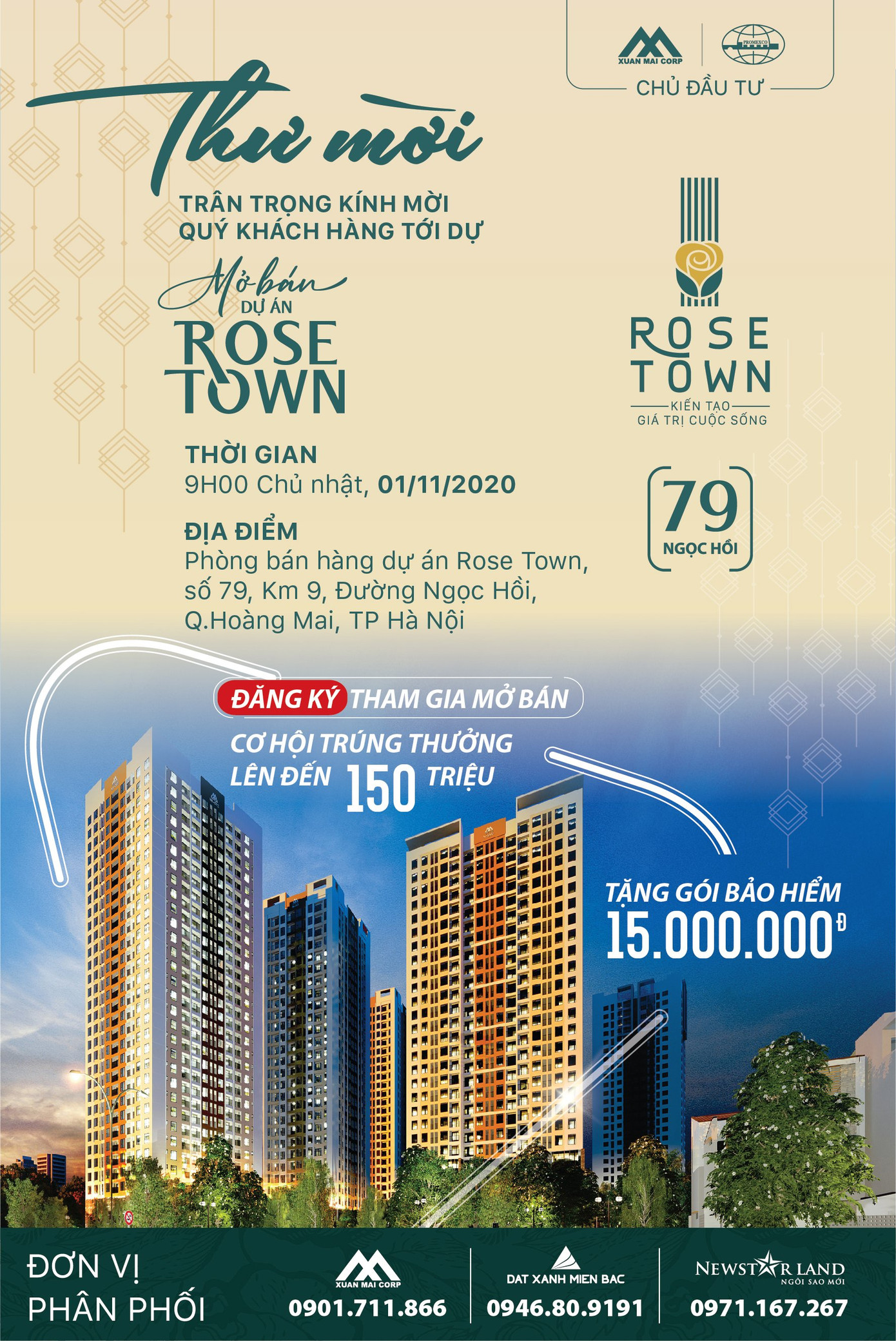 Ngày 01/11 tới đây, liên danh chủ đầu tư Promexco và Xuân Mai Corp sẽ tổ chức lễ mở bán đợt cuối các căn hộ tòa DV02, dự án Rose Town tại văn phòng bán hàng của dự án (số 79 Ngọc Hồi, Hoàng Mai, Hà Nội). Đây không chỉ là dịp để khách hàng và các nhà đầu tư tìm hiểu thông tin về dự án mà còn là cơ hội để sở hữu những căn hộ đẹp nhất của tòa DV02 đang được mở bán. Bên cạnh đó, sự kiện cũng là thời điểm để các khách hàng nhận được những ưu đãi hấp dẫn nhất từ trước tới nay.