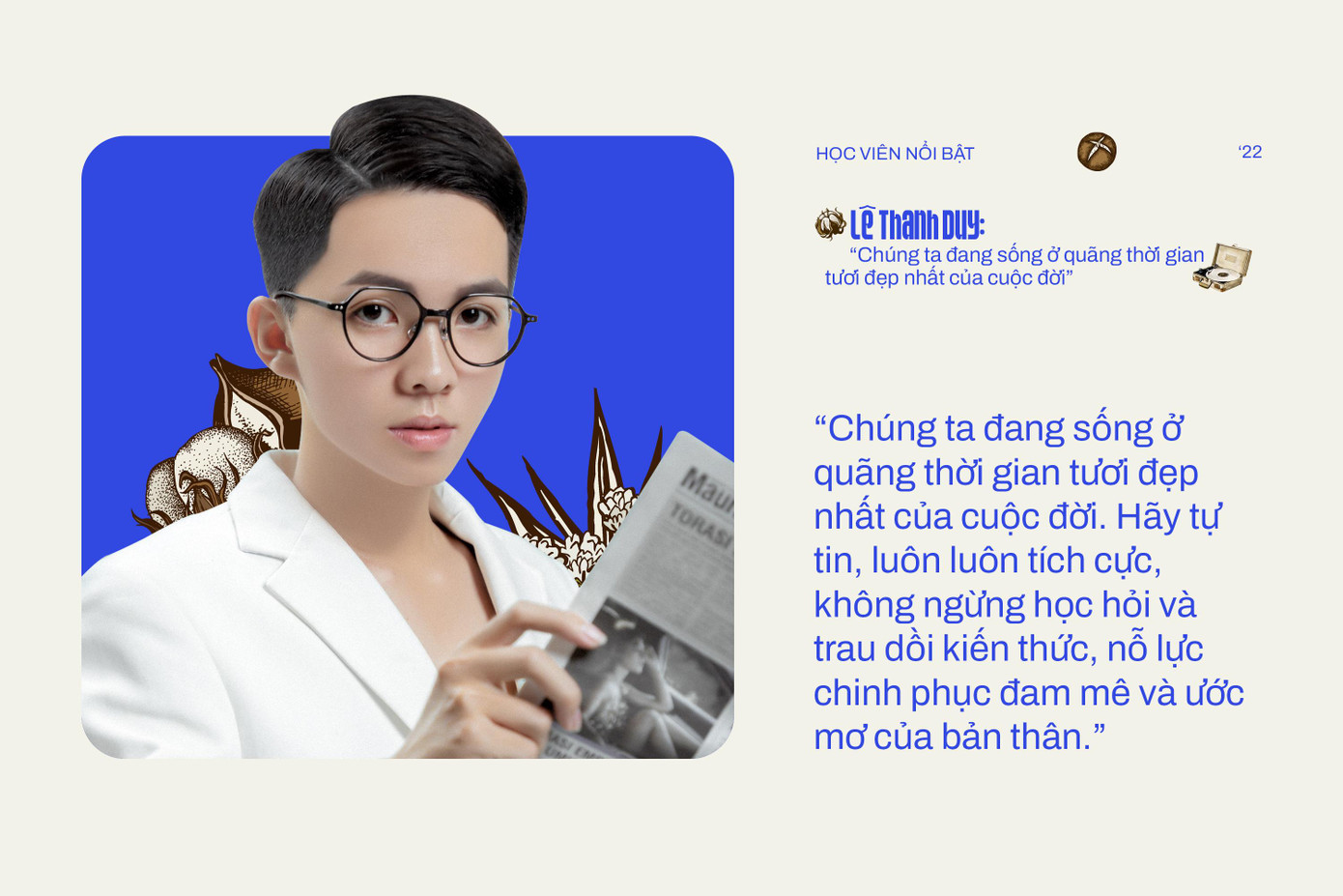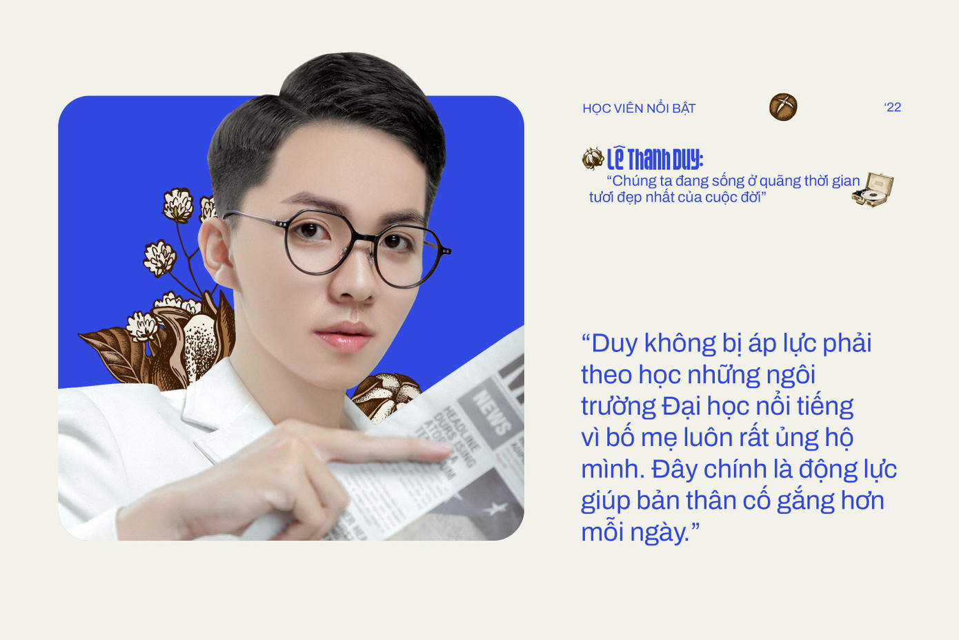Thấu hiểu điều này, Lê Thanh Duy gửi gắm: “Chúng ta đang sống ở quãng thời gian tươi đẹp nhất của cuộc đời. Hãy tự tin, luôn luôn tích cực, không ngừng học hỏi và trau dồi kiến thức, nỗ lực chinh phục đam mê và ước mơ của bản thân. Có vấp ngã mới đạt được thành công, vì đấy sẽ là những bài học mà không trường lớp nào có thể dạy chúng ta. Hãy viết lên câu chuyện cuộc đời mình thật đẹp nhé.”