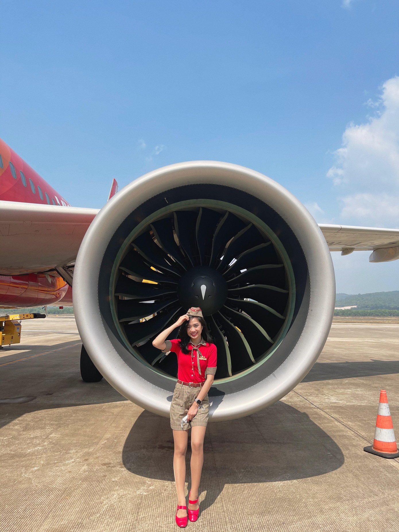 | Lê Thu Trang trong trang phục tiếp viên hàng không Vietjet mùa đông. |