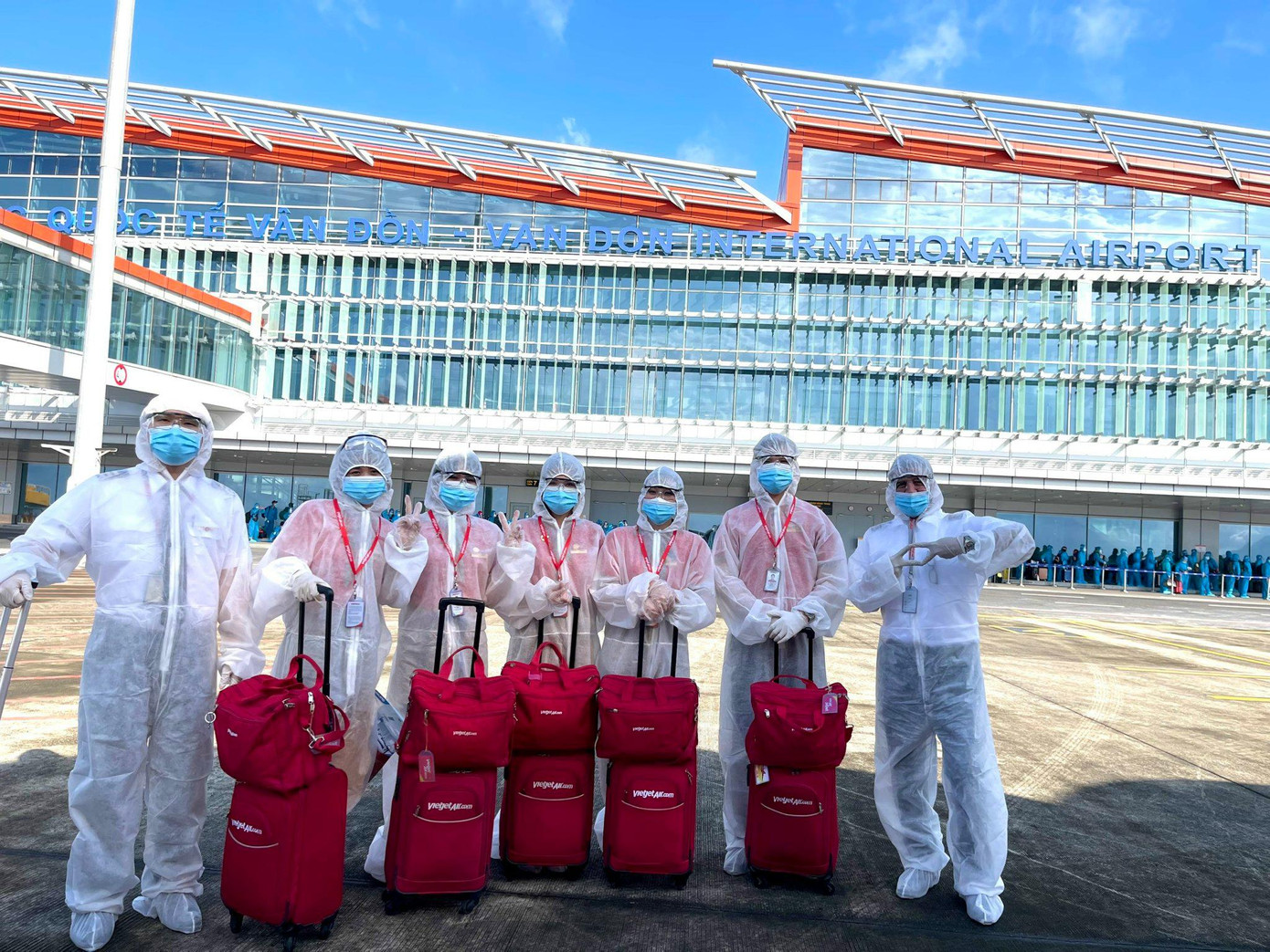 | Lê Thu Trang cùng đồng nghiệp trong bộ đồ bảo hộ khi thực hiện các chuyến bay trong thời điểm dịch COVID - 19 diễn biến phức tạp. |