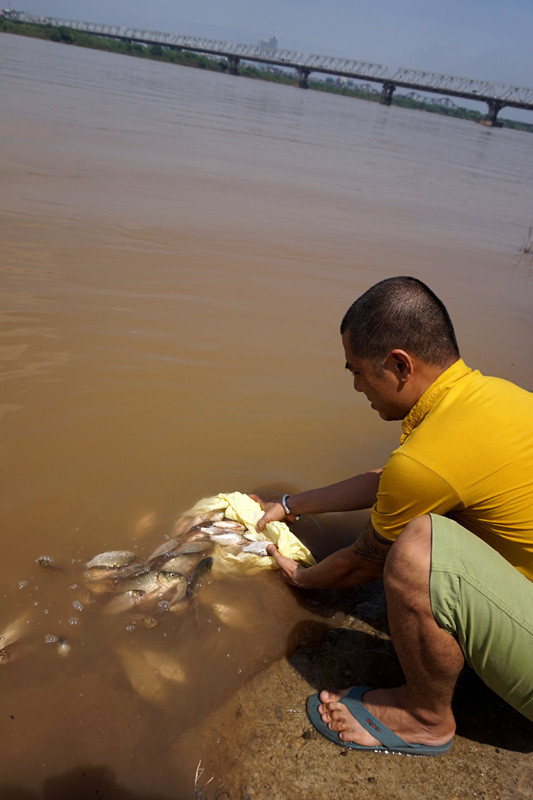 Người dân làm lễ phóng sinh cá, ốc, trạch... ven sông Hồng nằm ngay bên ngoài sân chùa.