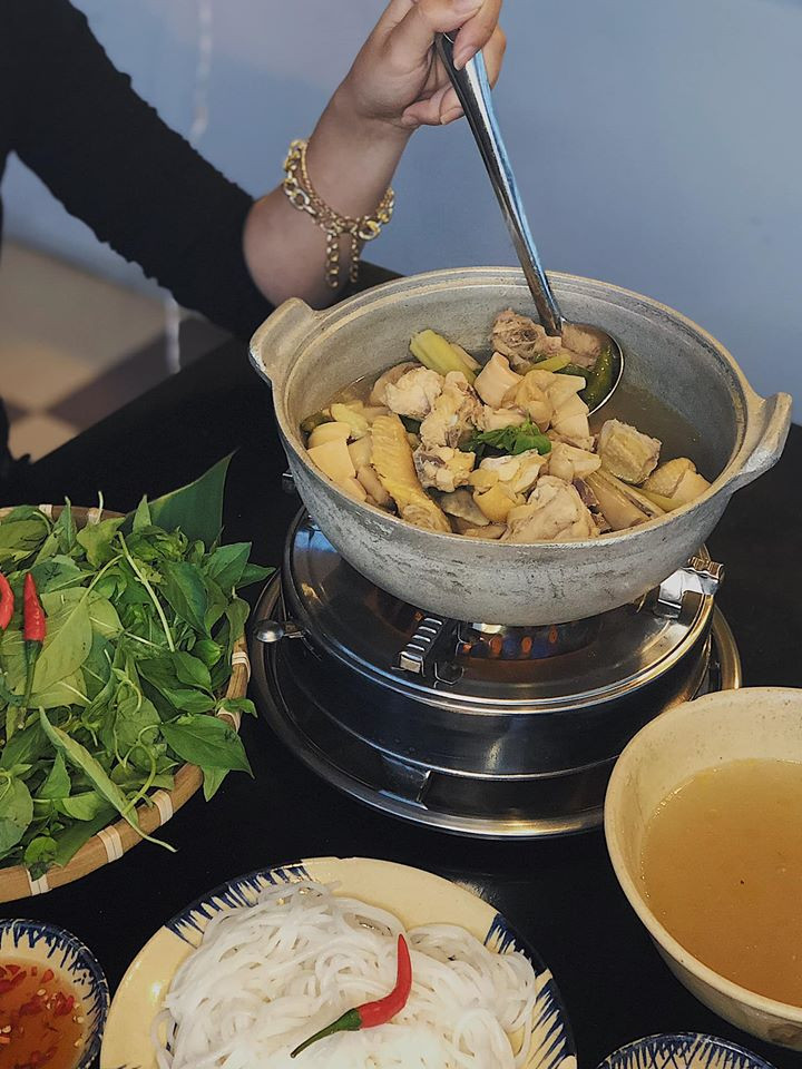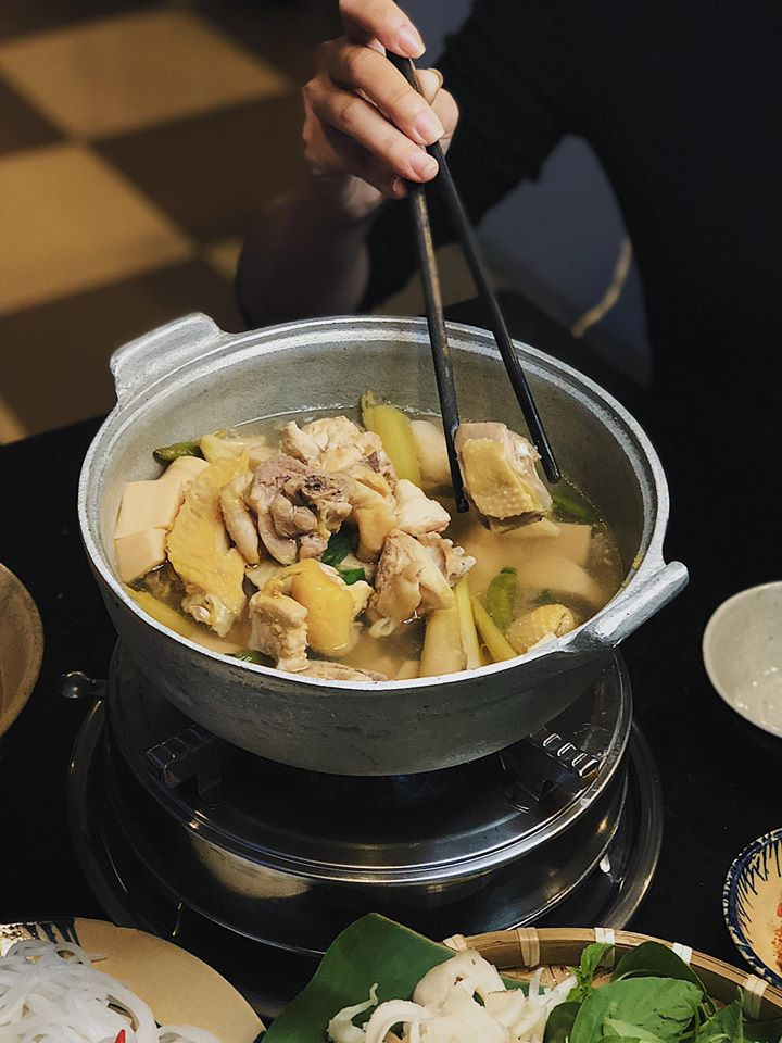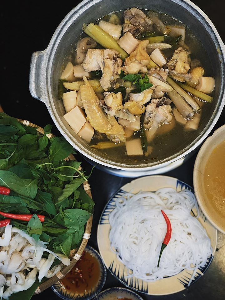 Nồi lẩu cực nhiều thịt gà, măng chua và kèm theo một mẹt nấm bào ngư, lá é phủ phê. Bún ở đây sợi rất tươi, chén mắm dằm ớt và muối tôm khiến cho món ăn thêm dậy vị. Súp lẩu nêm nếm vừa đủ, ngọt thanh vì được hầm rất lâu từ hầm gà, không hề có cảm giác “say” bột ngọt. Thịt gà dai, da óng vàng và cực kì thơm ngon.
