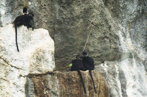 Đi tiếp một lúc sau, chúng tôi thấy rõ hơn đàn voọc trên sườn núi đá vôi, với khoảng 14-15 con. Toàn thân chúng có màu đen tuyền, ngoại trừ hai má trắng, đuôi của loài voọc này khá dài, trên đỉnh đầu lại có chòm lông đen hất lên.