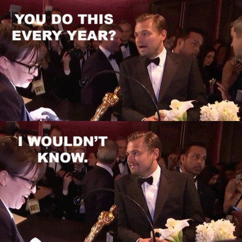Sau khi lễ trao giải kết thúc, nam tài tử đã phải trao tượng vàng cho nhân viên của ban tổ chức để khắc tên. Cảm xúc hân hoan trong lần đầu nhận tượng đã khiến Leo bật ra những câu hỏi hết sức ngây ngô và dễ thương: “Năm nào cô cũng phải làm việc này à (khắc tên lên tượng – PV)? Tôi không biết đấy.”