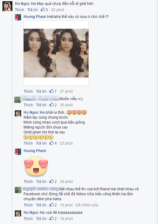 Tuy nhiên, trong một bài phỏng vấn mới đây với báo chí, Hồ Ngọc Hà cho biết, hiện tại vì một số lý do cô không trực tiếp quản lý trang cá nhân, cô và Phạm Hương đều chưa phải là bạn bè trên facebook, dù cả hai đã cố gắng xóa bớt bạn bè cũng không kết bạn được nhau nên từ trước đến giờ vẫn giữ chế độ follow. Theo đó, “Nữ hoàng giải trí” còn nhấn mạnh, nếu có ai đó đang nảy sinh ý định muốn chia rẽ họ thì đang làm chuyện vô ích.