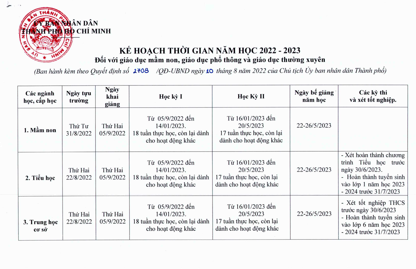 Theo kế hoạch năm học, thời gian của học kỳ I sẽ diễn ra từ 5/9/2022 đến 14/1/2023. Thời gian học kỳ II từ 16/1/2023 đến 20/5/2023. Thời gian kết thúc năm học từ 22 đến 26/5/2023.