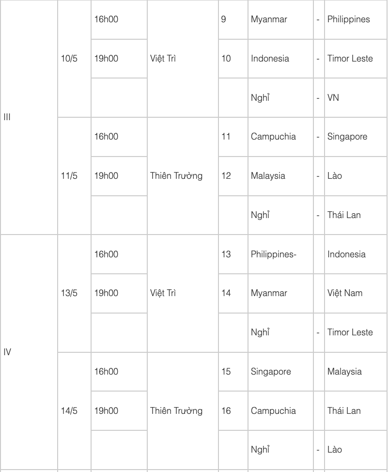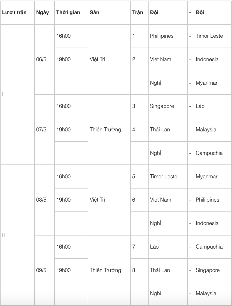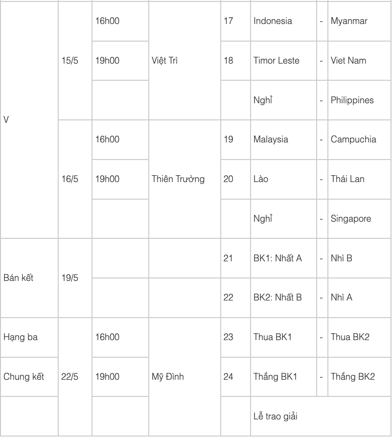 Ghi chú: Nếu đội Việt Nam vào Bán kết thì sẽ thi đấu lúc 19h00 tại SVĐ Việt Trì - Phú Thọ.