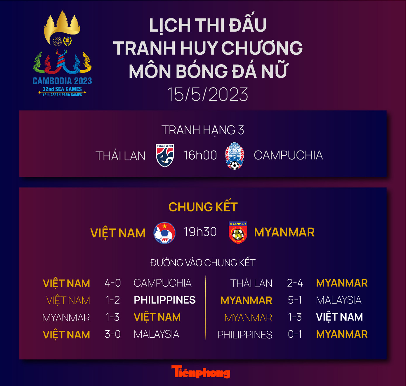 Theo lịch trình đã sắp xếp từ trước, trận chung kết bóng đá nữ giữa Việt Nam và Myanmar sẽ diễn ra vào lúc 19h30 ngày 15/5 tại Sân vận động Olympic Quốc gia ở Phnôm Pênh. Trước đó, hai đội Campuchia và Thái Lan sẽ tranh huy chương đồng vào lúc 16h00 cũng ở sân đấu này.