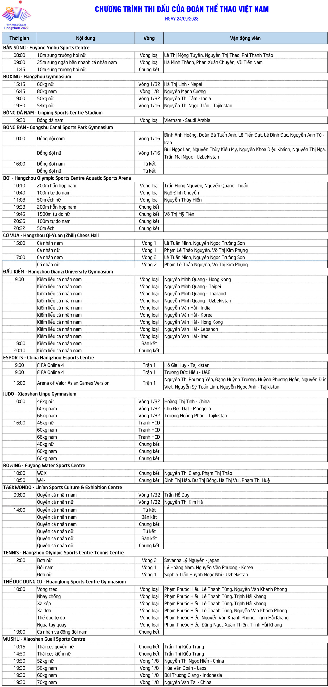 Vào hôm nay 24/9, rất nhiều môn bước vào tranh tài, bao gồm những môn có khả năng tranh chấp huy chương như boxing, taekwondo, wushu và bắn súng. Có thể gọi tên những niềm hy vọng như nữ võ sĩ taekwondo từng hai lần vô địch châu Á Trương Thị Kim Tuyền, huy chương Vàng wushu Asiad 17 Dương Thúy Vi, xạ thủ Trịnh Thu Vinh xếp hạng 5 chung cuộc Giải vô địch bắn súng thế giới 2023 vừa diễn ra, boxer Nguyễn Thị Tâm giành huy chương Bạc Giải vô địch thế giới hồi đầu năm.
