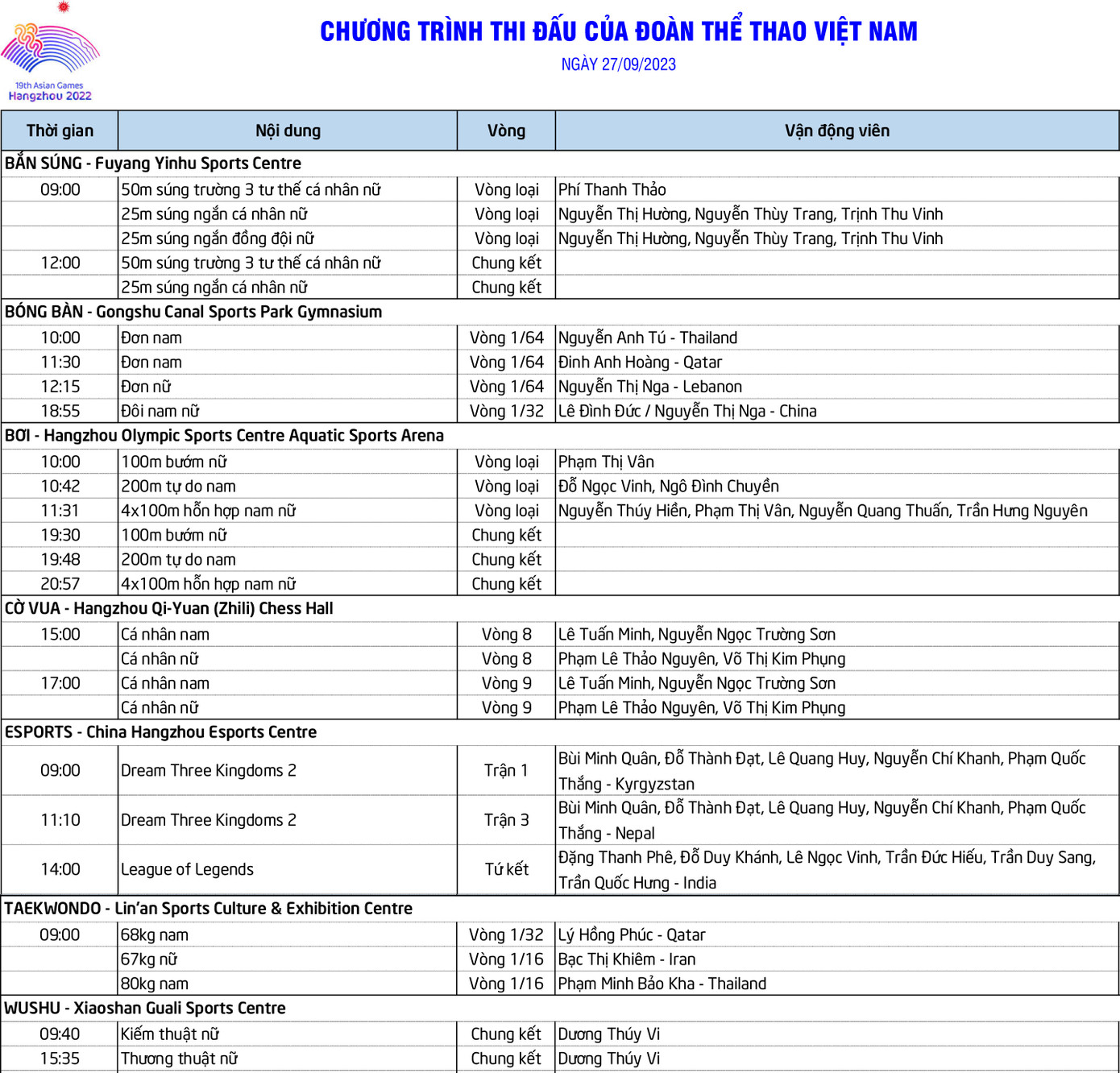 Mặc dù vậy, tin vui là võ sĩ Hứa Văn Đoàn đánh bại đối thủ Hàn Quốc Hong Minjun 2-0 ở tứ kết hạng cân 56kg nam môn wushu. Với tấm vé vào bán kết, Văn Đoàn cầm chắc một tấm huy chương ở Asiad 19. Bên cạnh đó kỳ thủ cờ vua Lê Tuấn Minh đang xếp đồng hạng nhì với 5 điểm/7 ván, kém người dẫn đầu Wei Yi (Trung Quốc) 0,5 điểm. Anh có cơ hội rất cao mang huy chương Vàng về cho Việt Nam nếu đánh bại Wei Yi trong ván đầu chiều nay, 27/9.