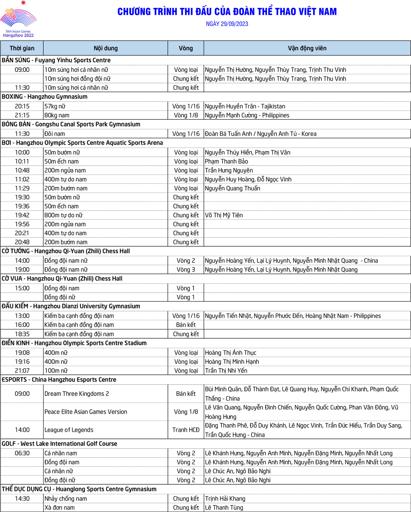 Hôm nay 29/9, chúng ta kỳ vọng sẽ có huy chương ở môn bắn súng (chung kết đồng đội 10m súng hơi nữ với sự tham gia của Trịnh Thu Vinh cùng các đồng đội), chung kết 3 nội dung TDDC. Bên cạnh đó, tuyển điền kinh cũng xuất trận ở vòng loại các nội dung 100m nữ và 400m nữ. Với việc cả 4 golfer đội tuyển golf Việt Nam đạt điểm âm trong ngày ra quân, người hâm mộ mong đợi họ sẽ tiếp tục phong độ đỉnh cao và làm nên kỳ tích.