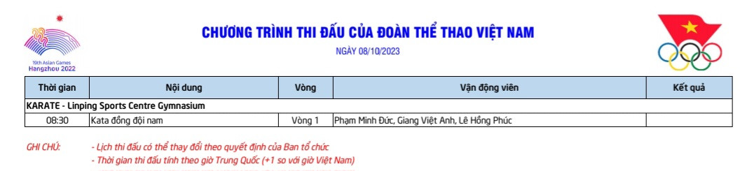 Kết thúc ngày thi đấu 7/10, đoàn thể thao Việt Nam xếp vị trí thứ 21 với 27 huy chương gồm 3 HCV, 5 HCB và 19 HCĐ. Hôm nay 8/10 Asiad 19 sẽ bế mạc nhưng vẫn còn 2 môn thi đấu, là bơi nghệ thuật và karate. Đoàn Việt Nam tham dự nội dung cuối, khi các võ sỹ Phạm Minh Đức, Hoàng Việt Anh, Lê Hồng Phúc tranh tài kata đồng đội nam. Chúng ta cùng hy vọng các võ sỹ có một ngày thi đấu thật tốt, tạo nên dấu ấn cuối cùng tại Hàng Châu trước khi nói lời tạm biệt.