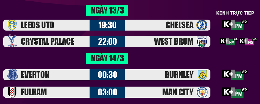 Chelsea bất bại 11 trận trên mọi đấu trường dưới thời HLV Tuchel Cũng ở loạt trận vòng 28 Ngoại hạng Anh hôm nay, Man City sẽ gặp tân binh Fulham. Trận đấu này sẽ diễn ra vào lúc 03h00 rạng sáng mai (14/3) tại sân Craven Cottage. Đây là cơ hội tốt để thầy trò Guardiola tiếp tục nới rộng khoảng cách so với phần còn lại trong cuộc đua vô địch.