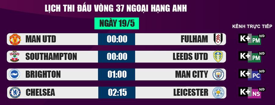 Ngoài trận cầu tâm điểm giữa Chelsea và Leicester, loạt trận vòng 37 Ngoại hạng Anh đêm nay còn có 3 cặp đấu khác. Trên sân nhà, MU sẽ tiếp đón Fulham, đội bóng đã sớm nói lời chia tay giải đấu số 1 nước Anh. Trong khi đó, nhà vô địch Man City sẽ có chuyến làm khách trên sân của Brighton. Cặp đấu còn lại là màn so tài giữa Southampton và Leeds Utd tại sân St Mary.