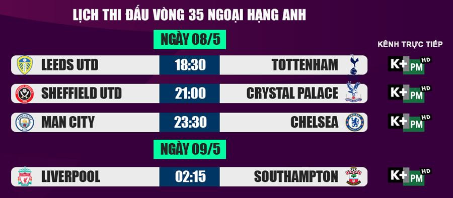 Ở vòng đấu trước, Man City chưa thể lên ngôi vô địch Ngoại hạng Anh do trận đấu giữa MU và Liverpool phải tạm hoãn vì cuộc nổi loạn của CĐV. Nhưng ở vòng 35 cuối tuần này, thầy trò Pep Guardiola có thể tự mình định đoạt ngôi vương. Kịch bản ấy sẽ xảy ra nếu họ đánh bại Chelsea ở trận đấu diễn ra vào lúc 23h30 đêm nay tại sân Etihad.
