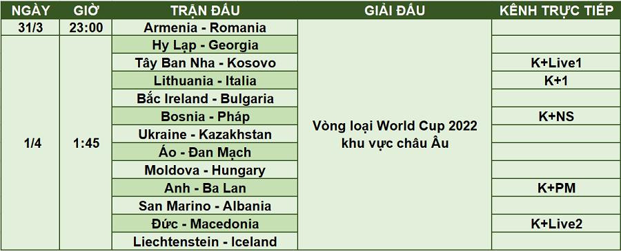 Ở bảng C, Italia chỉ phải gặp Lithuania. Dù phải làm khách nhưng đoàn quân áo thiên thanh vẫn được đánh giá vượt trội. Đây là cơ hội tốt để Azzurri giành chiến thắng thứ 3 liên tiếp ở vòng loại. Trước đó, thầy trò Mancini đã dễ dàng vượt qua Bắc Ireland và Bulgaria với cùng tỉ số 2-0.