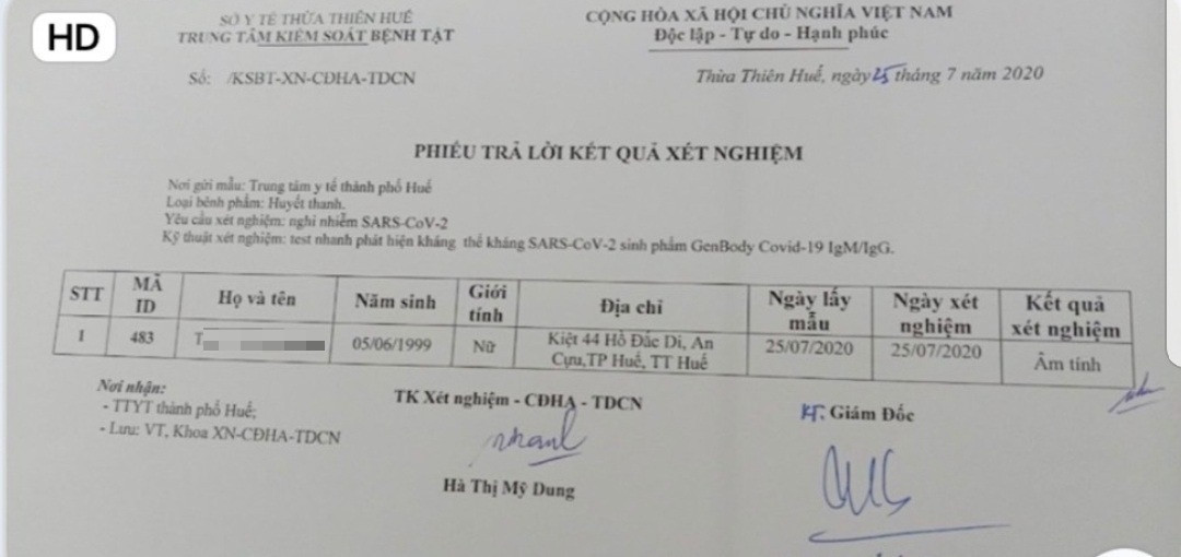 Chiều cùng ngày, thông tin từ Trung tâm Kiểm soát bệnh tật tỉnh TT-Huế cho biết, kết quả test nhanh đối với nữ sinh viên T.T.M.H cho thấy, người này hiện âm tính với SARS-CoV-2.