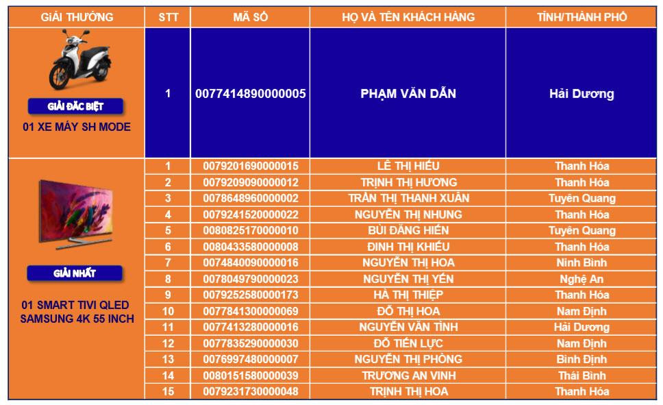 Lễ quay số đã tìm ra chủ nhân của hơn 1.000 giải thưởng, với tổng giá trị giải thưởng lên tới hơn 1,6 tỷ đồng. Trong đó, 01 giải đặc biệt là 01 xe máy SH mode; 15 Giải nhất, mỗi giải là 01 Smart Tivi Qled Samsung 4K 55inch; 30 giải nhì, mỗi giải là 01 tủ lạnh SamSung 280L; 60 giải ba, mỗi giải là 01 nồi chiên không dầu Phillip 2L và 900 giải khuyến khích, mỗi giải là 01 sổ tiết kiệm trị giá 1 triệu đồng.