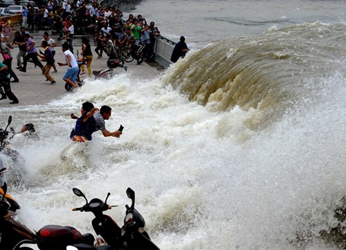 Hôm qua (17/8), tại khu vực vịnh Hàng Châu, thành phố Hàng Châu, tỉnh Chiết Giang, Trung Quốc, nơi có con sông Tiền Đường bất ngờ xuất hiện hiện tượng thủy triều dâng cao, kết hợp với gió tạo nên những con sóng dữ vượt qua cả bờ kè.