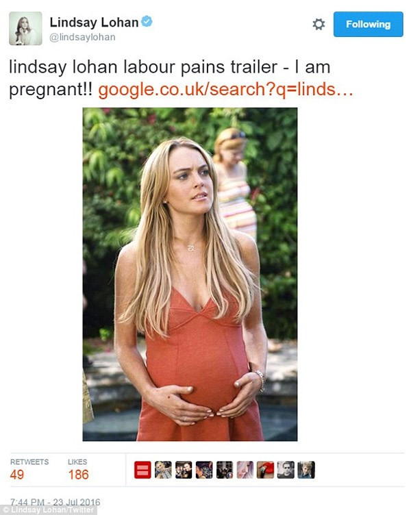 Dòng trạng thái Lindsay viết trên tweet “Trailer phim Labour Pains của Lindsay Lohan – Tôi đang mang thai!” khiến mọi người nghĩ cô đang mang thai
