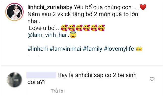 Chia sẻ vào ngày Valentine của Linh Chi. Tiếp sau đó, cô chia sẻ hình ảnh bên gia đình đầu năm và lấp lửng: "Năm sau hai vợ chồng con tặng bố hai món quà to lớn nha”. “Món quà” của Linh Chi khiến người hâm mộ không khỏi tò mò, nhiều người đồn đoán cặp sao đã hoặc có kế hoạch sinh em bé trong năm nay. Netizen bình luận “Hay là anh chị sắp có bé sinh đôi ạ?”.