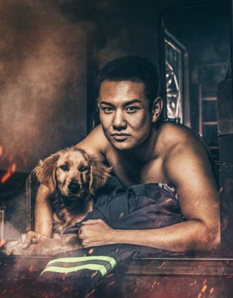 Đạo cụ chụp ảnh của các “mẫu nam” là xe cứu hỏa, chó cứu hộ, mũ bảo hộ, rìu, dây thừng, vòi phun nước...