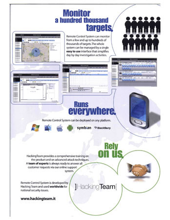 Theo số tài liệu quảng bá tiếp thị, Hacking Team mô tả sản phẩm RCS (cũng được gọi là Galileo) là "giải pháp được thiết kế để tránh tính năng mã hóa nhờ vào một công cụ được cài trực tiếp lên thiết bị" mà "khách hàng" đang muốn giám sát. Năm 2014, cả 2 công ty bảo mật Citizen Lab (trụ sở tại Toronto, Canada) và Kaspersky Lab (trụ sở tại Moscow, Nga) báo cáo phần mềm gián điệp của Hacking Team kiểm soát hoàn toàn các thiết bị di động để nghe lén.