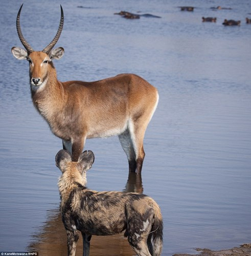 Lợi dụng sơ hở của bầy chó hoang và những con hà mã không để ý, linh dương nhanh chóng chạy trốn.