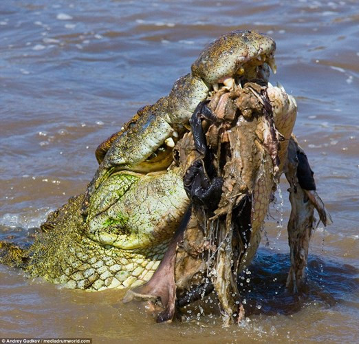 Sau nhiều ngày chờ đợi, phục kích bên dòng sông Masai Mara ở Kenya, Nam Phi, nhiếp ảnh gia động vật hoang dã Andrey Gudkov bắt được khoảnh khắc cực thú vị khi một con linh dương đầu bò thoát chết ngoạn mục khỏi cú đớp tử thần của cá sấu khổng lồ.