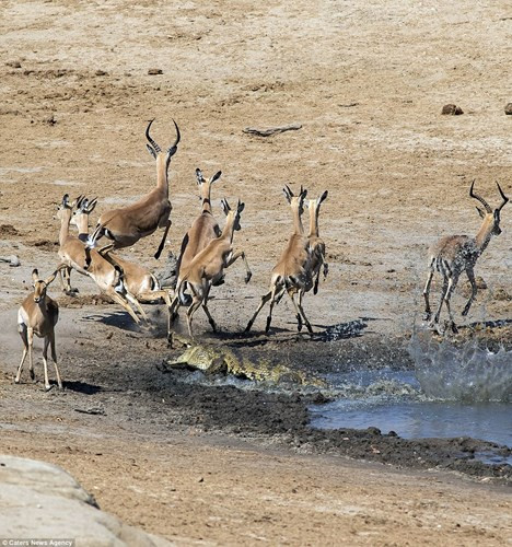 Những con linh dương nhảy khỏi mặt đất để tránh cú đớp của cá sấu, trước khi bỏ chạy toán loạn. Cảnh tượng được ghi lại bởi nhiếp ảnh gia người Pháp Francois Borman.