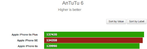 Với cấu hình kế thừa từ iPhone 6s, SE là mẫu iPhone đạt hiệu năng tốt nhất so với giá thành hiện giờ. Rẻ hơn gần 300 USD, nhưng kết quả thử bằng công cụ quen thuộc AnTuTu Benchmark 6 cho thấy hiệu năng của iPhone SE cao hơn iPhone 6s và gần bằng iPhone 6s Plus. Sản phẩm này đạt tổng điểm 134.358, ngang với điểm của các smartphone Android cao cấp đời mới 2016.