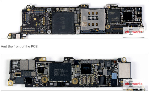 Trong đó, vi xử lý của máy là Apple A9 do công ty Đài Loan TSMC sản xuất, giống ở iPhone 6s. Dù Apple không tiết lộ, ảnh linh kiện bên trong đã xác nhận SE dùng RAM LPDDR4 với dung lượng 2GB cao gấp đôi iPhone 6, 5s và ngang bằng với iPhone 6s và 6s Plus. Thông tin về ngày in trên linh kiện rơi vào khoảng tháng 8 và 9 năm ngoái, trùng với thời điểm Apple ra mắt 6s và 6s Plus.