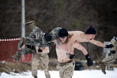Một binh sỹ Mỹ bế đối tác Hàn Quốc trong quá trình luyện tập.