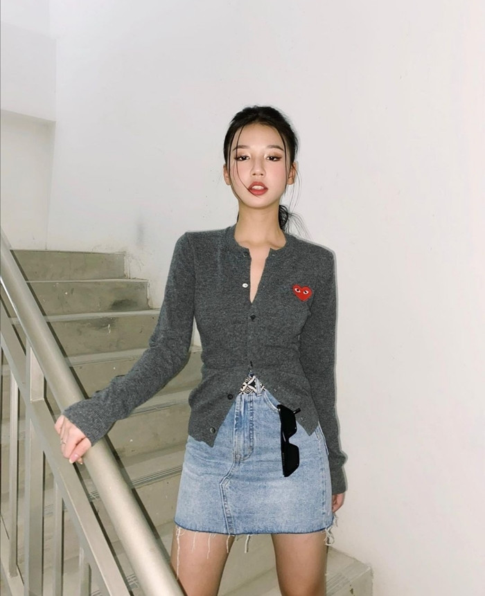 Amee vừa cá tính lại đáng yêu khi diện một chiếc áo cardigan in hình tim màu xám mix cùng chân váy jeans tua rua thời trang.