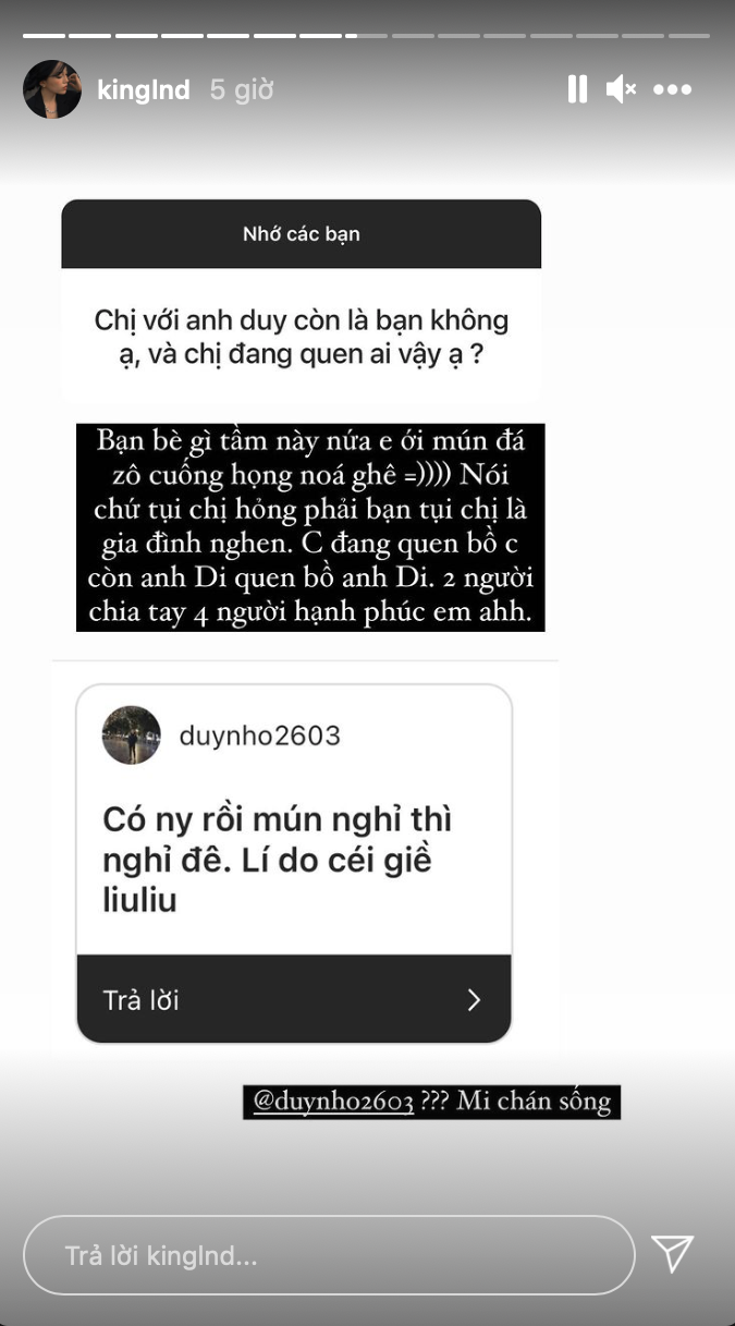 Mới đây, trong phần Hỏi - Đáp trên Instagram, có dân mạng đặt ra câu hỏi cho Linh Ngọc Đàm: "Chị với anh Duy còn là bạn không ạ và chị đang quen ai vậy ạ?". Nữ streamer đã không ngần ngại trả lời thẳng thắn: "Tụi chị không phải là bạn, tụi chị là gia đình nghen. Chị đang quen bồ chị còn anh Duy quen bồ anh Duy. 2 người chia tay 4 người hạnh phúc em ạ".
