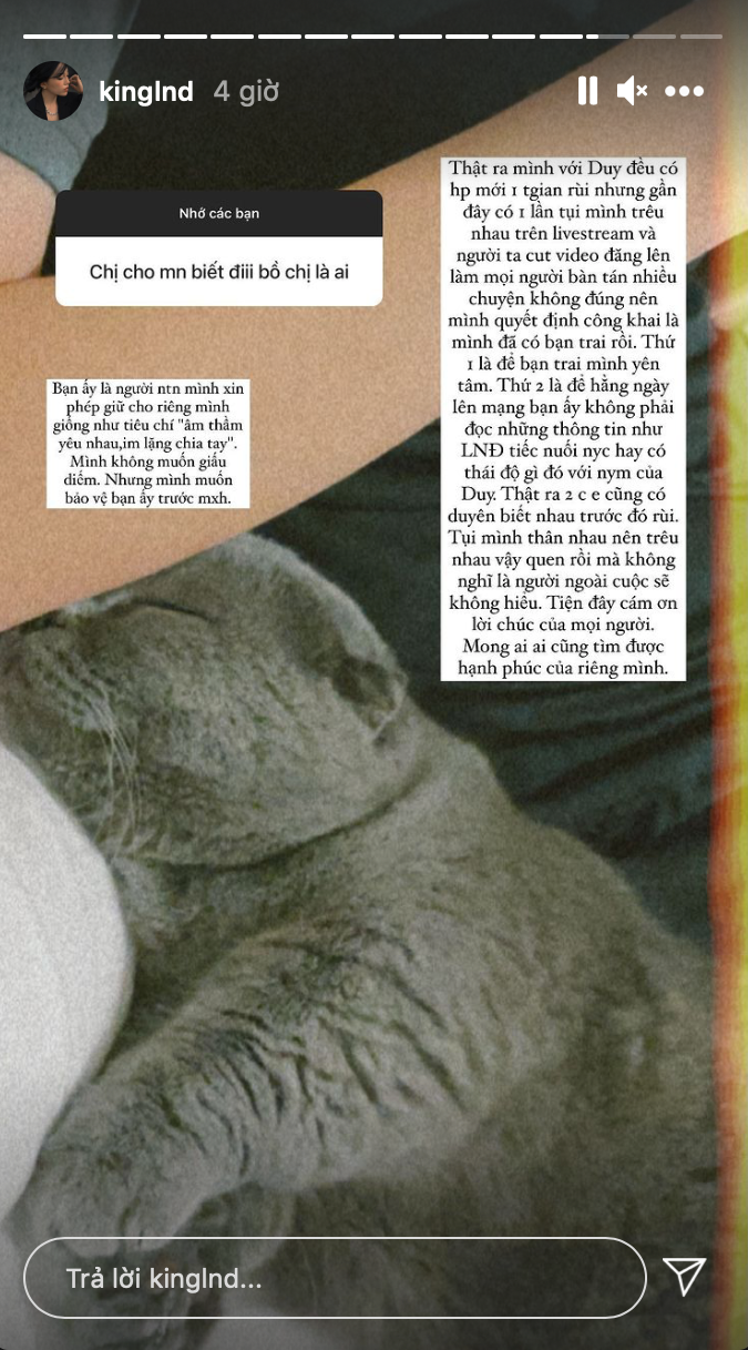 Nữ streamer sinh năm 1996 còn cho biết: "Thật ra mình và Duy đều có hạnh phúc một thời gian rồi nhưng gần đây có một lần tụi mình trêu nhau trên livestream và người ta cut video đăng lên làm mọi người bàn tán nhiều chuyện không đúng nên mình quyết định công khai là mình có bạn trai rồi. Thứ nhất là để bạn trai mình yên tâm. Thứ hai là để hàng ngày lên mạng bạn ấy không phải đọc những thông tin như: Linh Ngọc Đàm tiếc nuối người yêu cũ hay có thái độ gì đó với người yêu mới của Duy...".