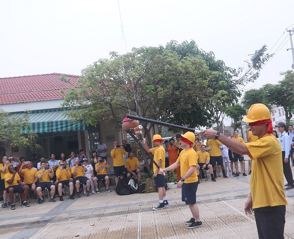 Đội lính hải quân Mỹ tham gia trò chơi bịt mặt đập niêu trong sự cổ vũ của đồng đội. Ảnh : Nguyễn Thành