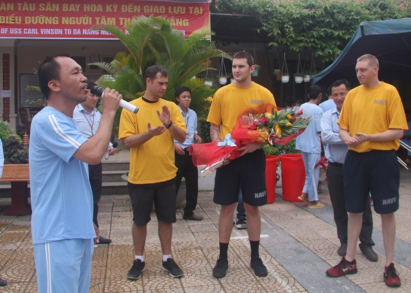 Sáng ngày 6/3, nằm trong khuôn khổ các hoạt động thuộc chương trình thăm Đà Nẵng của nhóm tàu tác chiến USS Carl Vinson (Hải quân Mỹ), một nhóm lính tàu sân bay đã đến tới thăm và giao lưu với các bệnh nhân đang điều trị tại trung tâm điều dưỡng người tâm thần Đà Nẵng. Ảnh Nguyễn Thành