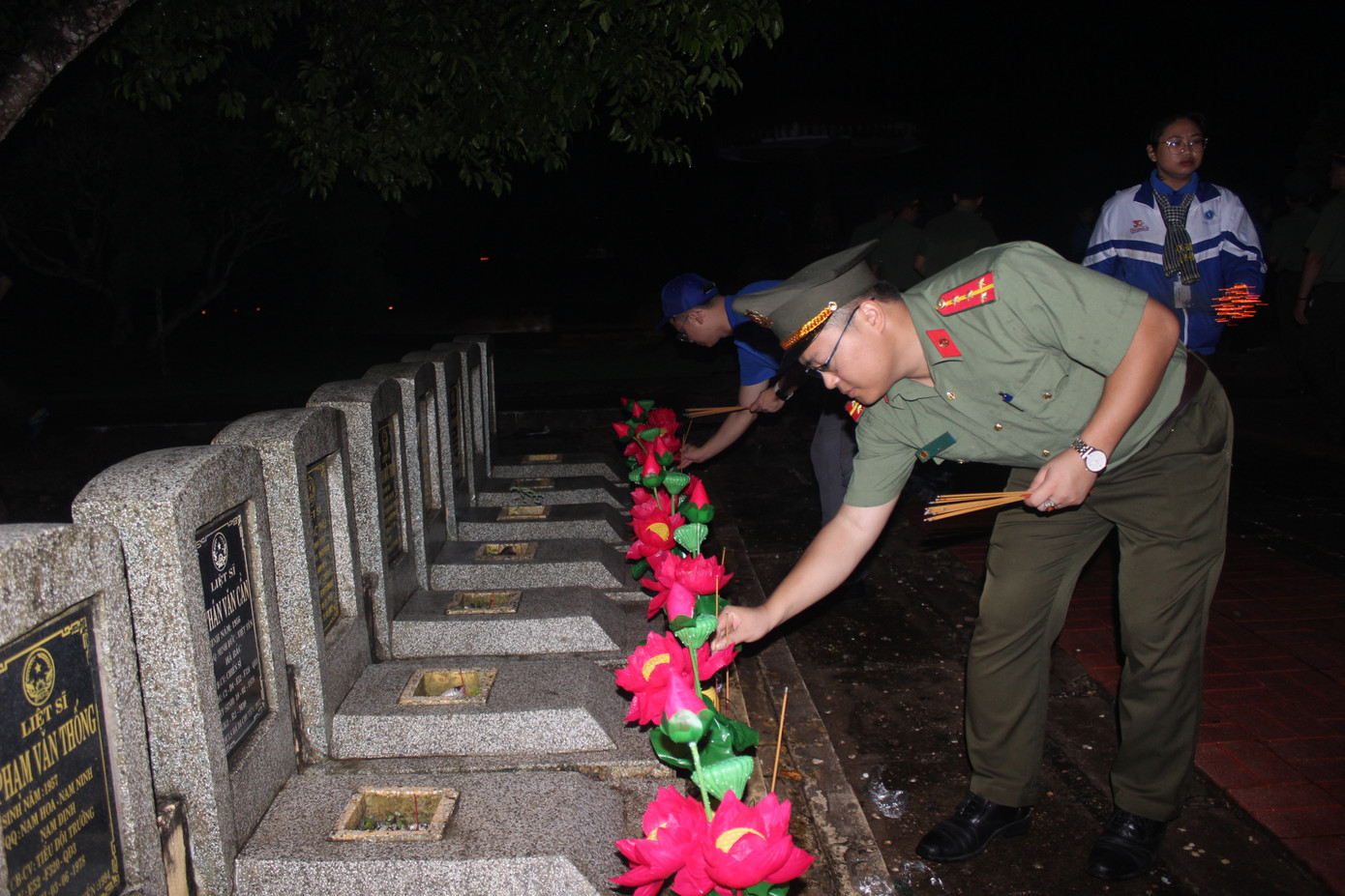 | Đoàn viên, thanh niên tỉnh Tây Ninh thắp nến, dâng hương tại Nghĩa trang Liệt sĩ Tân Biên. |