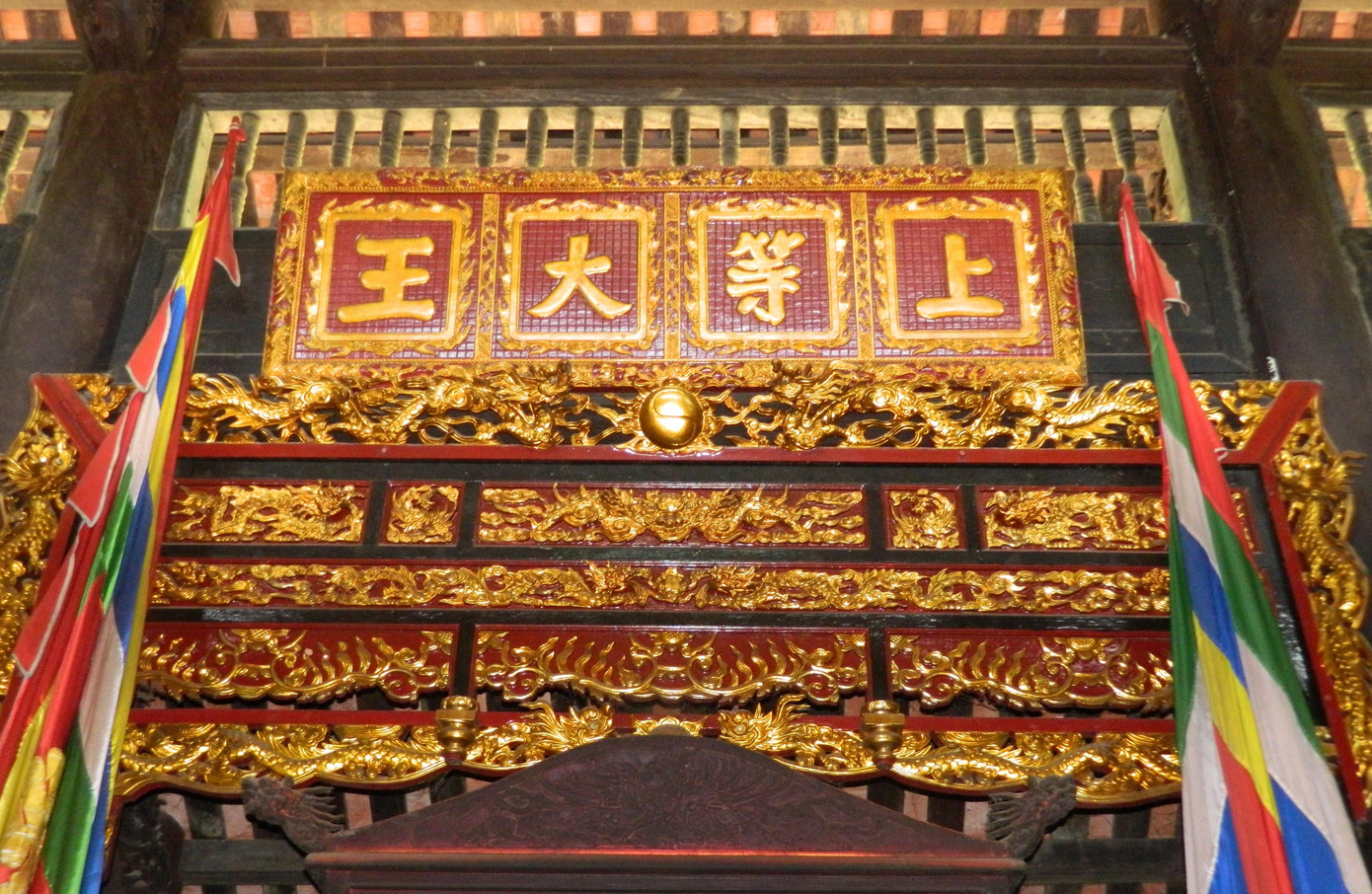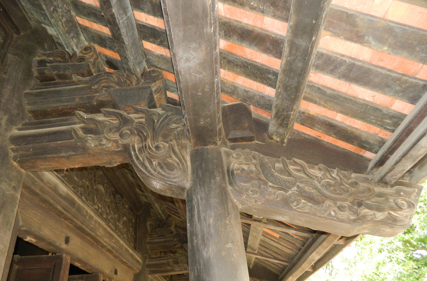 | Sau tòa trung đường là hậu cung, một kiến trúc ba gian, hai tầng mái cong, với bốn vì kèo kiểu “giá chiêng chồng rường, kẻ bẩy”, bốn hàng chân cột. |