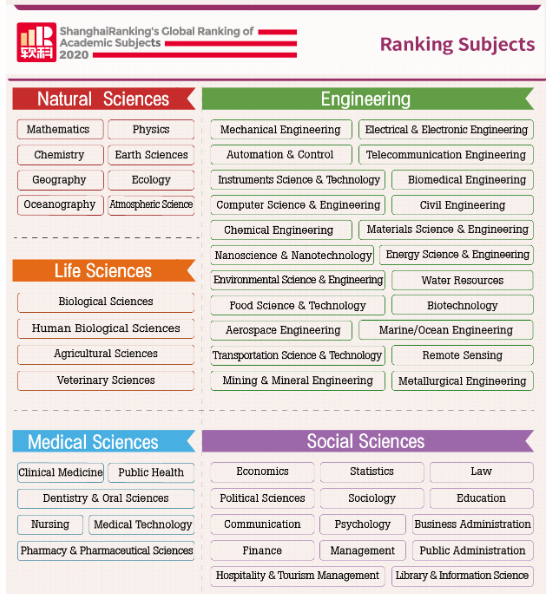 Bảng xếp hạng đại học thế giới theo lĩnh vực GRAS 2020 của tổ chức ShanghaiRanking Consultancy xếp hạng cho hơn 4000 cơ sở giáo dục đại học thế giới thuộc 54 ngành thuộc 5 nhóm ngành (bao gồm Khoa học Tự nhiên; Khoa học Kỹ thuật; Khoa học sự sống; Y khoa; Khoa học xã hội).