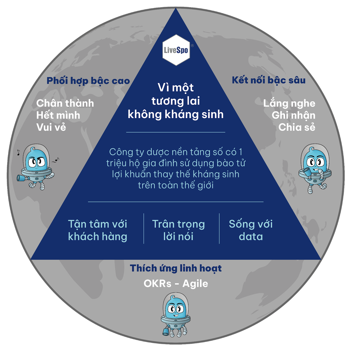 Tầm nhìn của LiveSpo vào 2025 sẽ trở thành công ty dược chuyển đổi số có “1 triệu hộ gia đình sử dụng Bào tử lợi khuẩn thay thế kháng sinh trên toàn thế giới”.