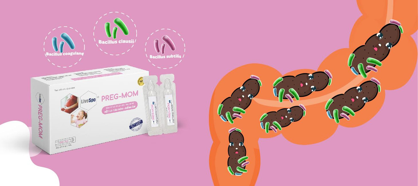 Bào tử lợi khuẩn LiveSpo Preg-Mom là sản phẩm ứng dụng công nghệ “Bào tử lợi khuẩn Dr. ANH” với thành phần chứa trên 3 tỷ bào tử lợi khuẩn Bacillus subtilis, Bacillus clausii, Bacillus coagulans và nước cất vừa đủ 5ml có tác dụng: