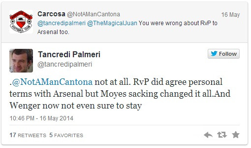 Twitter của nhà báo nổi tiếng người Italia Tancredi Palmeri đã khẳng định rằng Arsenal đã đàm phán để đưa tiền đạo Robin Van Persie trở lại Emirates. Thậm chí họ đã đạt được các điều khoản cá nhân với tiền đạo người Hà Lan.