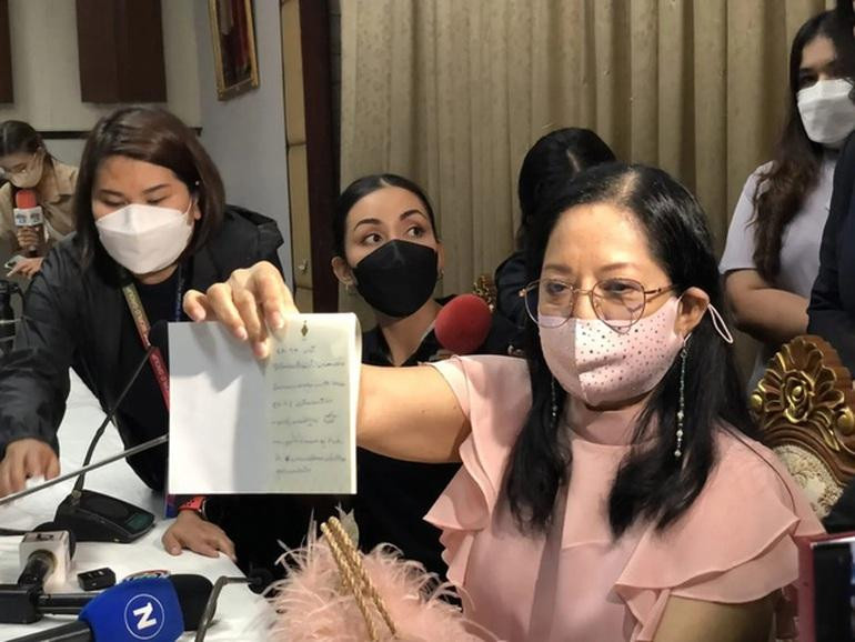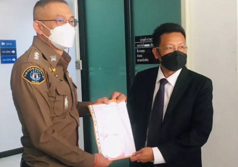 Luật sư Decha (luật sư cũ của mẹ nữ diễn viên Tangmo Nida) giao nộp giấy tờ cho cơ quan điều tra, ngày 30/5 (Ảnh: Thairath).