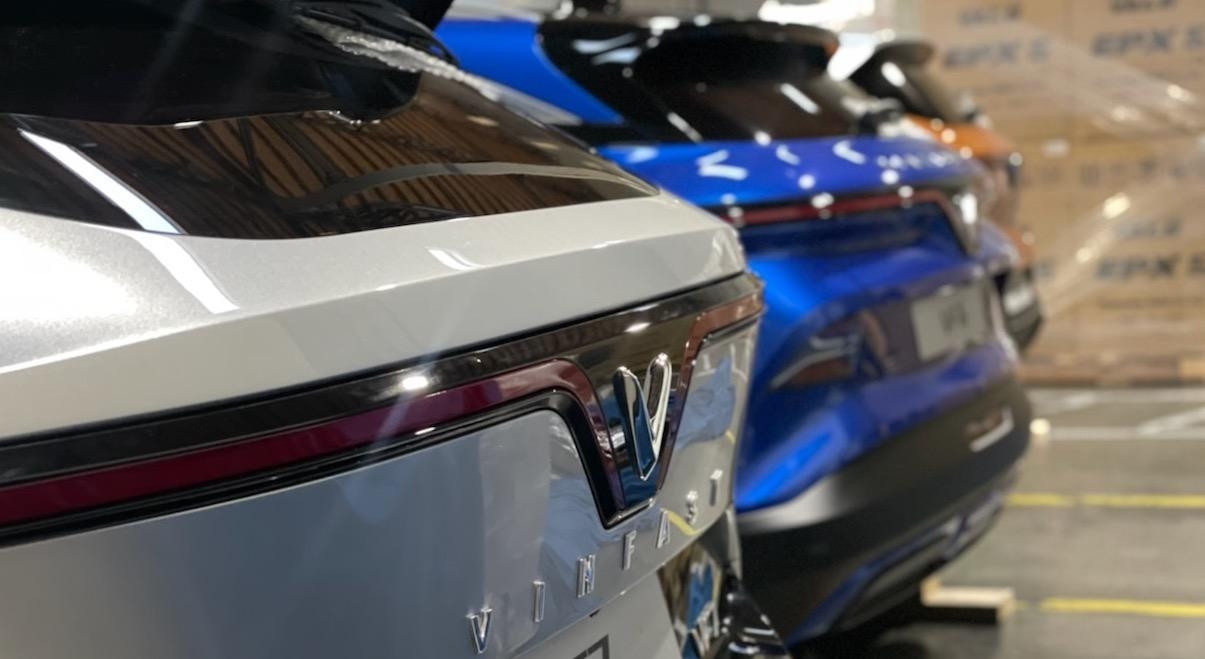 Một góc được “vén màn” của dàn xe điện VinFast. Trong hình ảnh, dễ nhận thấy là mẫu VF e35 đã từng được ra mắt tại Los Angeles Auto Show 2021. Tuy nhiên, trong containter bên cạnh là một mẫu xe “lạ” với màu xanh nổi bật. Nhiều khả năng, đây là 1 trong 3 mẫu sẽ xuất hiện lần đầu tại Las Vegas.